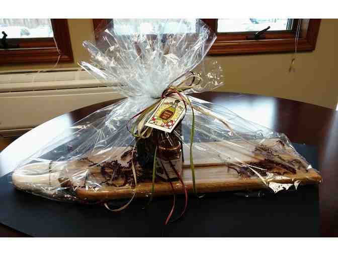 $50 Gift Card from Clove Brook Market Garlic & Oil Cutting Board with pretzels and raspberry honey mustard dipping sauce from "Garlic & Oil" in Sparta NJ
