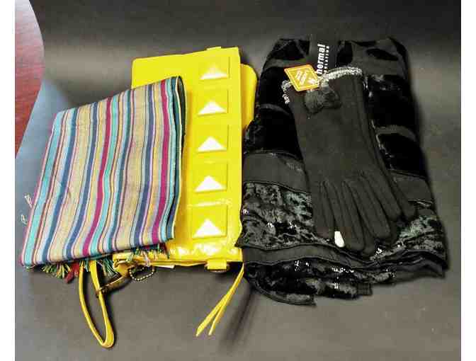 Nihao Yellow Clutch Bag, Designer Scarf & Gloves (Hillard's) & $20 GC Inner Designs