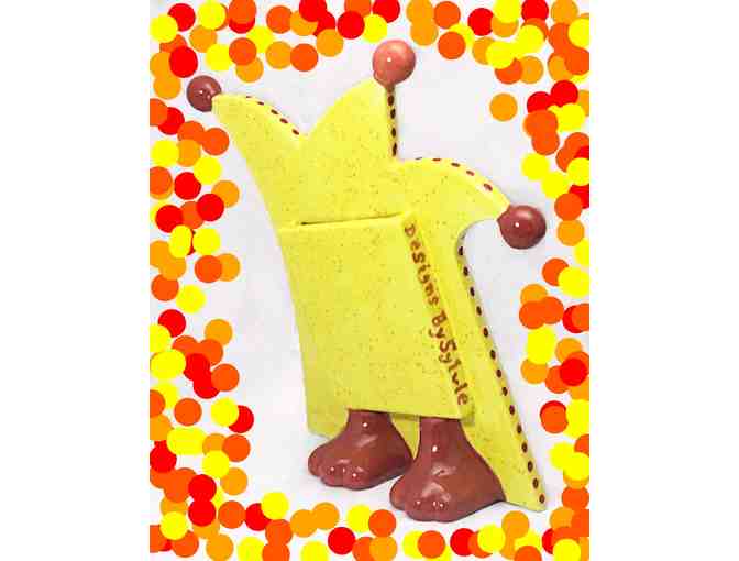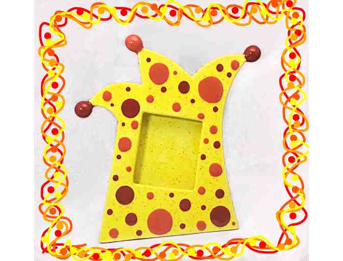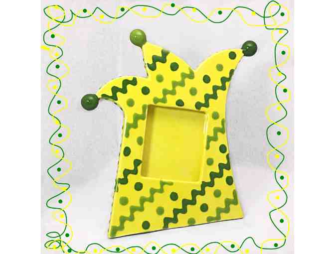 These are pure fun and perfect for kids! They are ceramic and made by Sylvie. They resemble a court jester hat and the picture is inserted from the top into the space for display.. As you can see in the picture, they have cute little feet in the back which are painted in the contrast colour. Both have bright yellow as the base colour and the decorative elements are (a) corral and carnelian and (b) 2 different shades of olive green. The colours in the pictures are true. The frames measure 7.25 X 5.25 inches (18 X 13 cm) and the picture display area is 2.75 X 2.5 inches (6 X 7 cm).