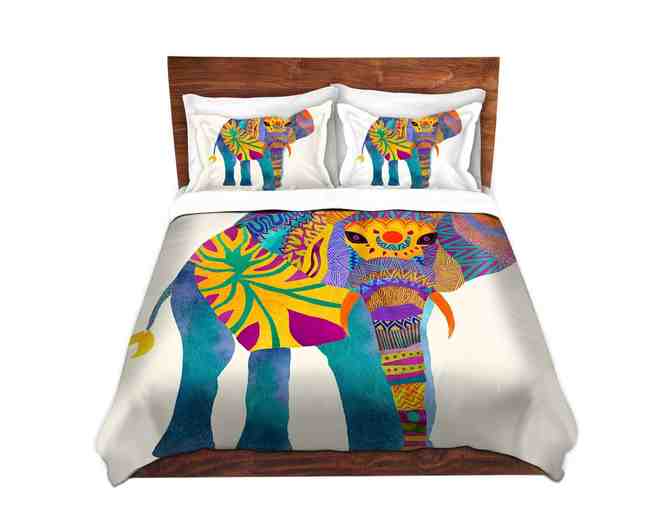 Make your favourite animal the focal point of your bedroom with this vibrant and colourful elephant (Pom Graphics Design). This duvet cover, called "Whimsical Elephant I" is from DiaNoche Designs and is of the highest quality. It is a classic medium weight twill (cotton/poly blend) with a printed top, ivory coloured underside and a smooth look and feel. It has a hidden zip closure with lace ties in each corner to hold the duvet securely inside. Wash upon arrival for maximum softness. Dye sublimation printing adheres the ink to the material for long life and durability. Made in the USA.