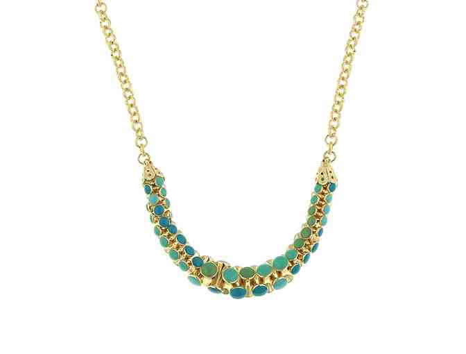 This is a stunning piece. Gold-toned beads intertwine and are artfully decorated with bright turquoise enamel for a stylish accessory that's perfect for summer or adds a glamorous pop against black evening wear. Adjustable from 16"L to 19"L.