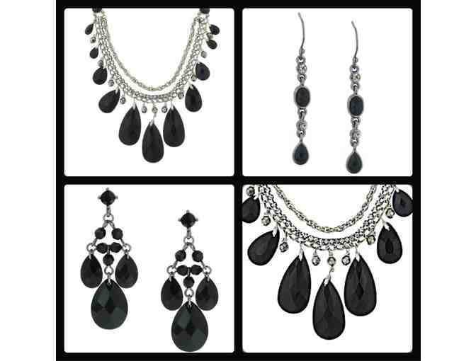 This is a gorgeous and versatile suite of black jewelry that you can adapt to the occasion. You can wear only earrings or, if wearing the dramatic necklace, you can add impact with the large earrings or tone it down with the more petite linear earrings.
