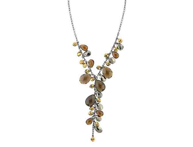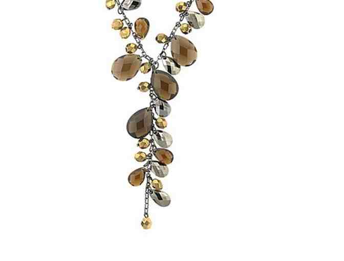 This Y-drop necklace is the epitome of elegance! Graduated jewels of smoky topaz and metallic gunmetal colors drape down the neckline alongside metallic golden beads giving it shine and sparkle. The hematite tone chain is adjustable to wear at different lengths. Chain measures:16"L x 1/4"W; Adjustable from 16"L to 19"L; Feature Tassel: 3 1/2"L.