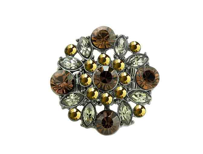 This stretch ring is sure to make a statement and perfectly complements the Y necklace. Round multifaceted smoked topaz color crystals are evenly spaced around the ring’s face and interspersed with black diamond color marquise-cut crystals. Additional petite crystals accent the two colors beautifully on the hematite tone base. Measures 1 1/2" in diameter.