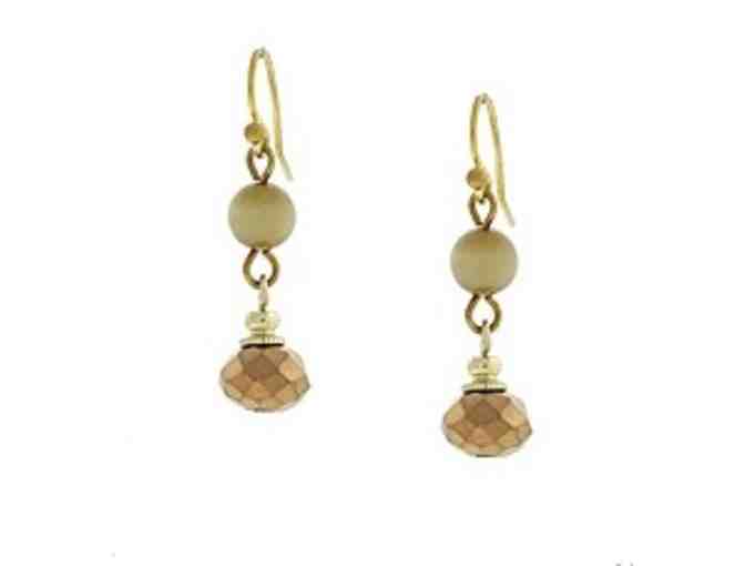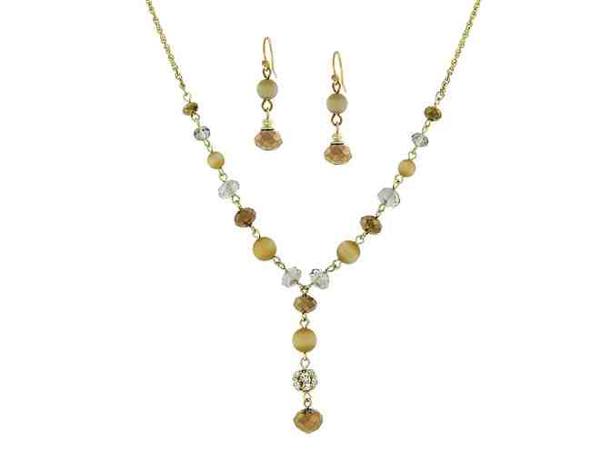 This simpler Y necklace is great daywear. It features a combination of amber colored Cat's Eye beads, lux-cut grey beads, and copper-toned beads with a clear crystal fireball accent on a 16" gold-toned adjustable chain. The matching beaded drop earrings complete the look and also pair well with the more elaborate Y necklace. Necklace measures: 16"L x 1.9"H x 3"W; Adjustable from 16" to 19" L; Earrings measure 1.25"L x 0.38"W.