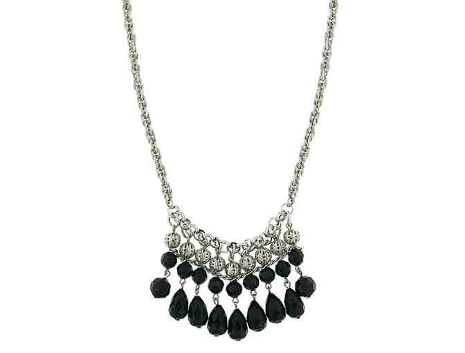 Be bold in black with this statement making beaded bib necklace set in a shining silver tone. A thick French rope style chain connects to a tiered bib composed of interlocked silver tone links, hollow filigree style beads, and two layers of spherical and teardrop shape multifaceted black beads that give off a subtle sparkle. The perfect accessory for edgy glamour. Chain measures: 16"L x 1/2"W' Adjustable from 16"L to 19"L; Bib measures 1 1/2" across and 2" long.
