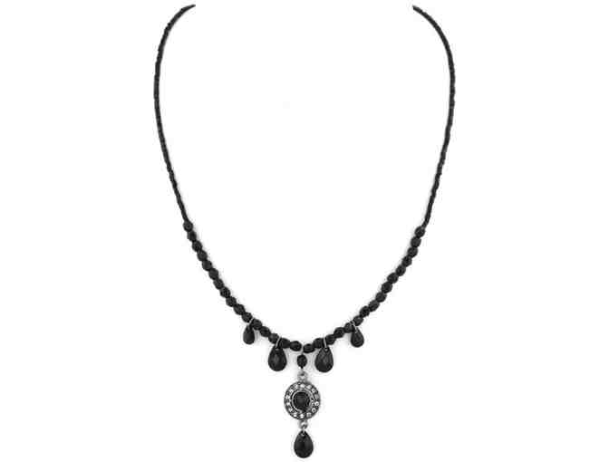 This last necklace is a great accessory for evening and more formal events. It has faceted jet black beads that line the necklace and features jet black tear drop beads that guide your eye to the elegant jet and simulated black diamond pendant. Chain measures 15"L x 1/8"W; Adjustable from 15" to 18"L; Feature pendant measures 1 2/4"L x 1/2"W.