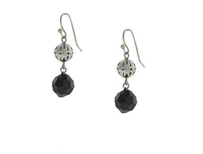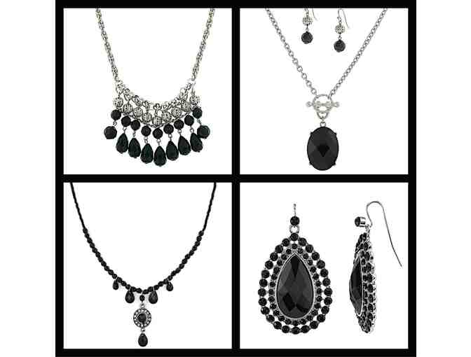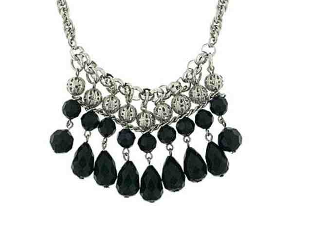 Now this necklace is more modern and sophisticated. It has a 16" silver-tone adjustable chain with front toggle detail and faceted oval jet black stone. The matching earrings complement it well but also match beads on the bib necklace and work with the final necklace if you want to keep if more understated. Necklace measures: 16"L x 1.75"H x 0.75"W; Chain adjustable from 16" to 19" length; Earrings measure 1.25"L x 0.38"W.