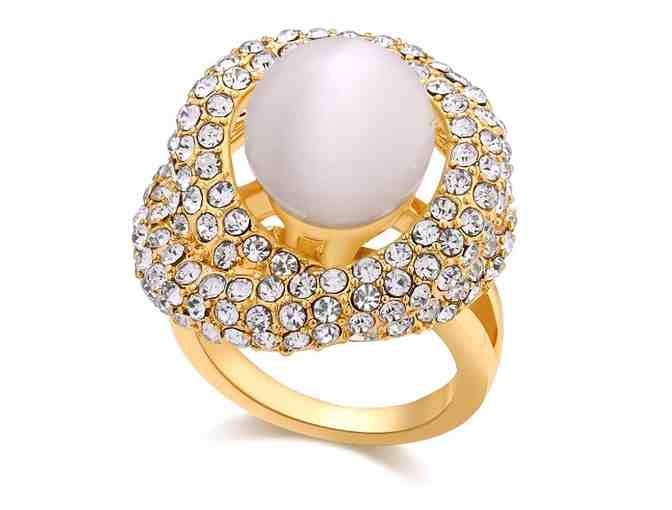 Have fun with this fashion jewelry cocktail ring from GUESS in size 7. A high-shine halo encircles imitation pearl for an elegant look against a matt goldtone body. Imitation pearl and glass.