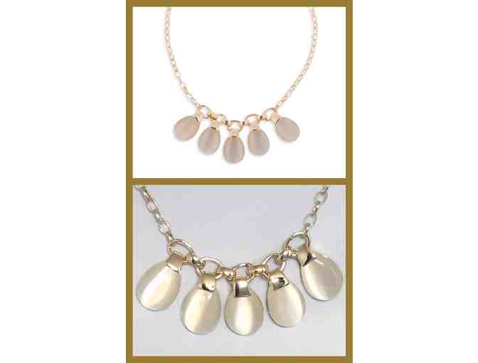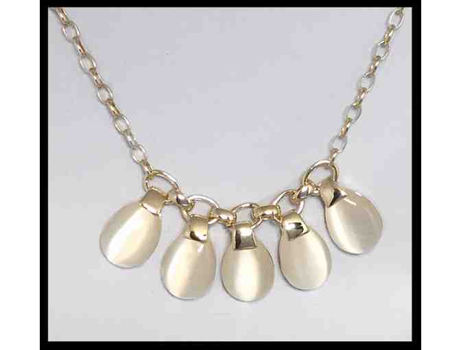 Make a style statement with this gorgeous designer fashion jewelry necklace. It combines both modern and classic style elements into a versatile collar necklace that can be worn as either day wear or evening wear depending on the occasion. The picture from online does not do it justice-it was so much more impressive when it arrived that I took an additional picture that I added here to try to capture the beauty of the cat-eye pendants. It has five drop cat-eye pendants set within high polished goldtone casings that are interconnected with large links that are echoed in the smaller links of the chain. It is extremely well made and speaks of quality. The necklace is about 16" with a 2" extender.