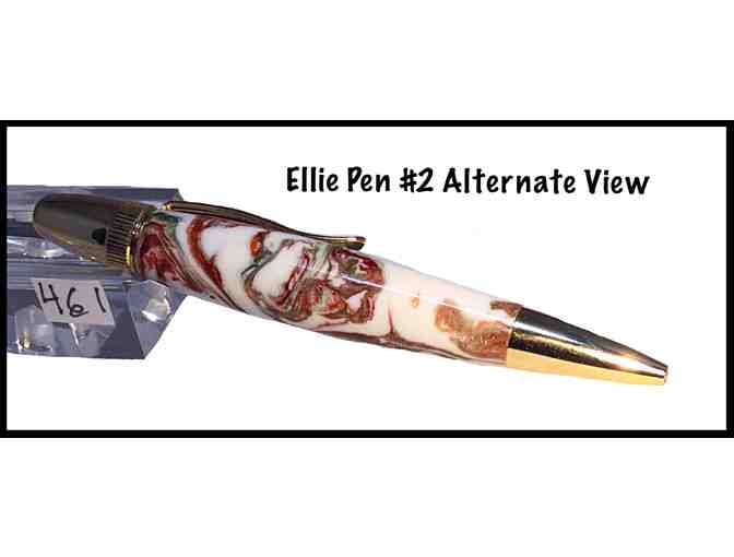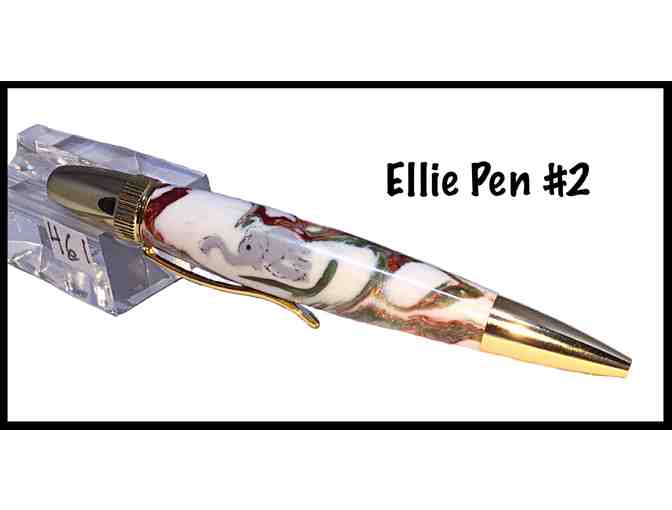Bet you never thought you would find a pen with such an adorable min-ellie on it! This is a modern yet elegant Carbara twist pen with 24kt gold-plate hardware. It measures about 12.5 cm (just under 5") and you simply twist it towards you to open and away to retract it. The body of the pen is acrylic with a tiny grey elephant that has been scrolled and embedded into a cream background with beautiful flecks and swirls of metallic copper and green. The elephant was embellished with outlining details that were hand carved and painted. It was polished with carnuba wax which is extremely durable. It comes in its own velveteen drawstring pouch. It was hand-crafted, carved and polished on a lathe by John Baker and Sylvie Malenfant and donated to the auction to help bring the Mendoza4 home.