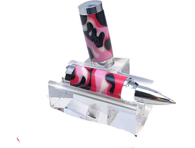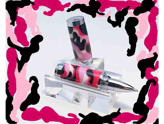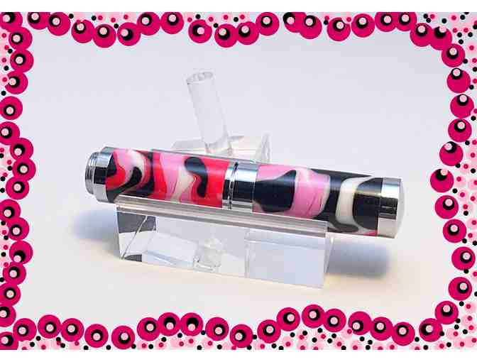 The LIPSTICK PEN is the perfect pen and fashion accessory in one! This one in "Hellcat Cammo" acrylic is pure fun. It's the perfect on-the-go pen in your handbag and when not in use it looks just like a lipstick. It easily uncaps and screws onto the end to convert into a unique, fun and stylish pen. It comes with a blank ink cartridge in the pen AND a spare one, as well as its own velveteen draw string pouch. It is hand-crafted and finished by John Baker on a lathe.