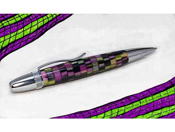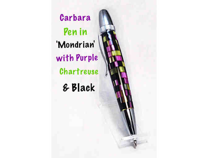 This Carbara Pen combines a modern sleek design with a fun "Mondrian" acrylic body. Brightly coloured rectangles of violet, chartreuse and black contrast against the chrome hardware for a vibrant modern look. It is quite striking and not altogether captured in the pictures. It measures about 12.5 cm (just under 5") and comes in its own velveteen pouch.The pen comes with an unmarked black ink catridge but takes easily obtained Parker Style Ball Point, Gel INk or Schmidt Easy Flow 9000 refills.