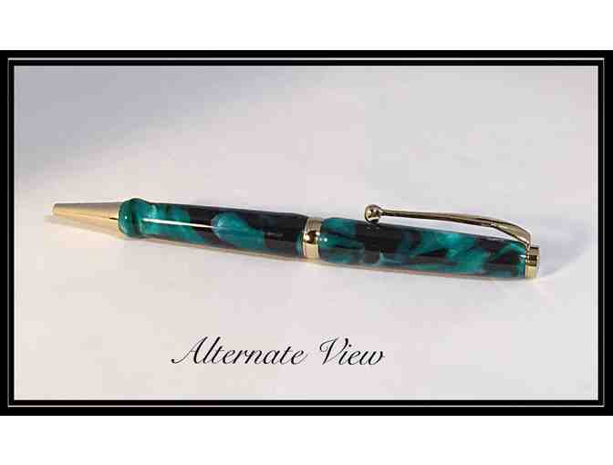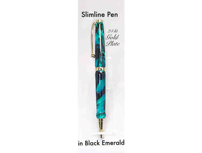 This is a very pretty Slimline Twist Pen in Black Emerald Acrylic with 24kt Gold Plate hardware. The turned body has a unique profile that adds to its aesthetic. The Black Emerald acrylic is quite striking, with real depth and almost iridescent. It was hand crafted on a lathe by John Baker with love and care and donated to the auction to help bring the Mendoza4 home. The pen comes with a black ink cartridge and takes Cross Style refills.