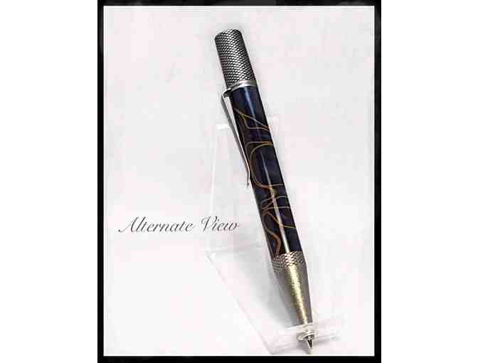 al Swirl" acrylic body. It consists of a black/grey nacreous reflective base within which are beautiful swirls of metallic bronze with red highlights. It's quite spectacular and difficult to capture in the pictures. Perfect for the serious 'professor' who likes to jazz it up a little! It was hand crafted on the lathe and finished with a durable and hard carnuba wax. It measures 12.5 cm or just under 5 inches and comes in its own velveteen drawstring pouch. The pen comes with an unmarked black ink cartridge but takes easily obtained Parker Style Ball Point or Gel Ink refills.