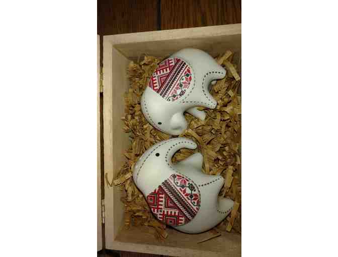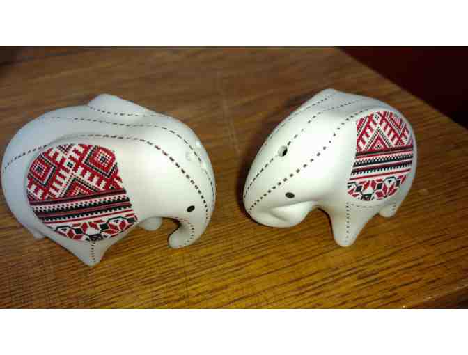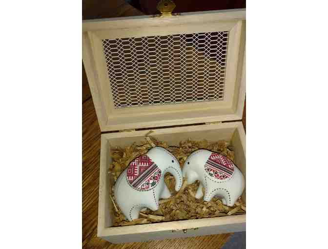 Detailed, Handpainted (red & black), Ceramic Elephant Salt & Pepper Shaker Set. Comes in cute, unfinished wood box with white metal mesh top for storage or display.