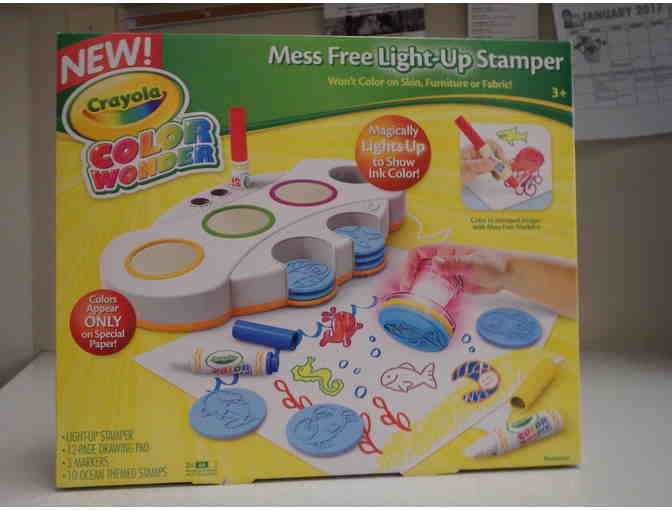 Magical, Mess-Free Stamping! Color Wonder inks are clear but the Mess-Free Light-Up Stamper magically knows what color you're using. Hold this creative toy over the orange ink pad and the handle lights up orange. Watch it change colors over the green and purple pads too. With 10 ocean-themed stamps, this art toy makes a great gift of Crayola for toddlers. Includes 12 pages of Color Wonder paper, three mini markers, and 10 ocean-themed stamps.
