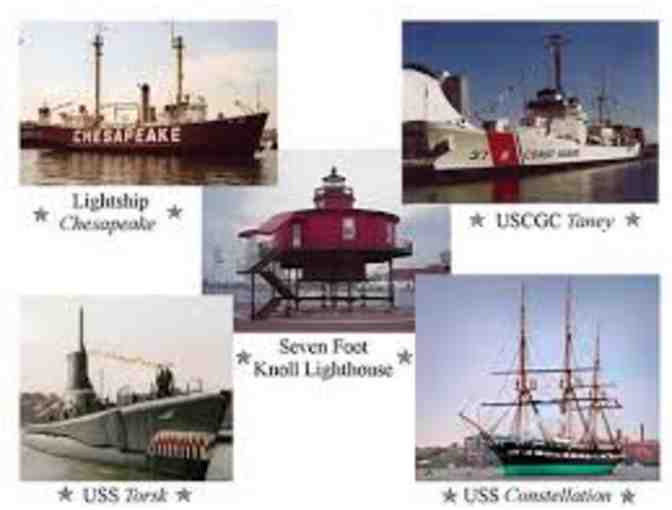 This certificate is redeemable for tickets for four people to visit all HSB sites: USS Constellation, OSS Torsk (submarine), USCGC Taney, Lightship Chesapeake, & Seven Foot Knoll Lighthouse.