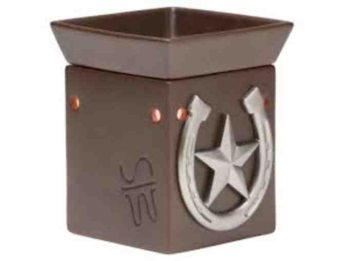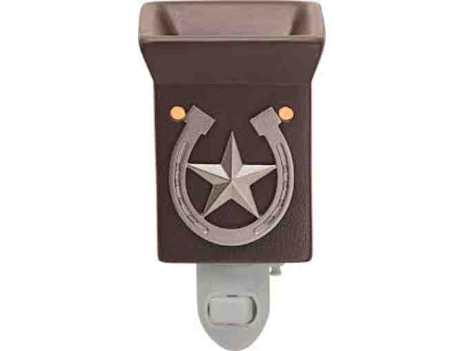 Scentsy Plug-In warmer in "Wrangler" which is a dark brown square shaped piece featuring a horseshoe design.