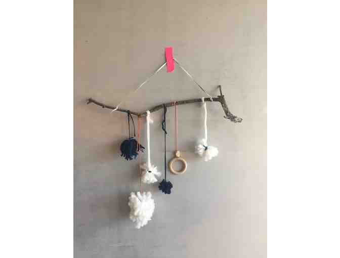 Unique mobile created by the students of Ms. Nees’s fourth grade class. The students learned how to make yarn pompoms and designed these wall hangings with branches and wood beads and leather lacing. Dimension vary by piece but each is approx 1 foot wide x 2 feet long.