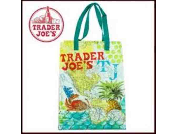 Including: Organic Olive Oil, Balsamic Vinegar, Masala Sauce, Greek Olives, Organic Honey, Cowboy Salsa, Trek Trail Mix, Organic Granola, Sparkling Lemonade, Italian Breadstic, Salted Caramel Coconut Cookies, Chocolate Truffles, Ginger Tea in a Re-usable Trader Joe's bag.