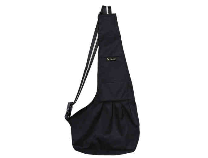 Black pet shoulder sling made of strong oxford cloth. Comfortable pleated sitting area for your pet. Adjustable strap. Made by Tailup.