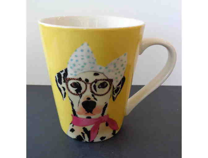 Christopher Vine Australia Porcelain Mrs. Dalmation "The Mob Mugs". Yellow 16 oz. porcelain cup with a doggie wearing a retro bowtie design headband, pink neck scarf & leopard frame glasses. Made by The Mob in Australia. Dishwasher & microwave safe. Too cute!