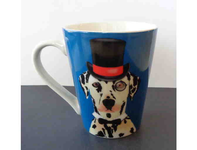 Christopher Vine Australia Porcelain Mr. Dalmation "The Mob Mugs". Blue 16 oz. porcelain cup with a doggie wearing a tophat, bow tie & monocle. Made by The Mob in Australia. Dishwasher & microwave safe. Too cute!