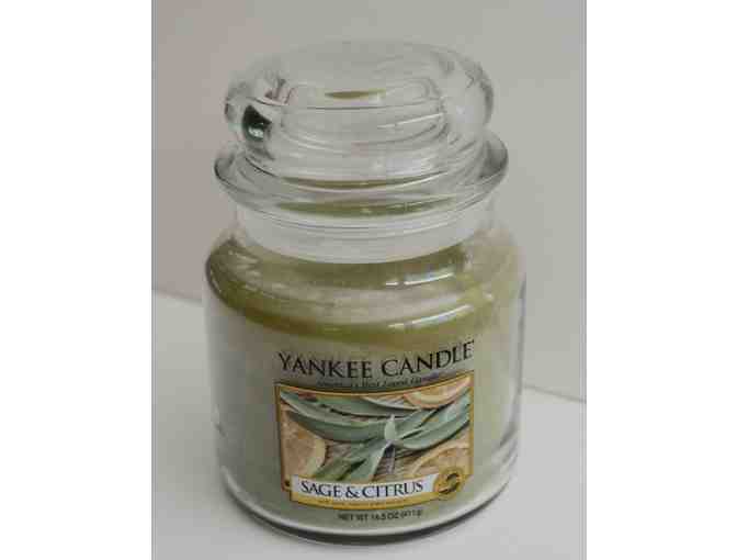 New Yankee Candle Company Sage & Citrus Medium Jar Candle. Let the worries of the day slide away with the help of this relaxing herbal blend of earthy sage, luxurious talc, and lemon-lime. 65 to 75 hours of fragrant burn. 14.5 oz and jar measures 4” x 5".