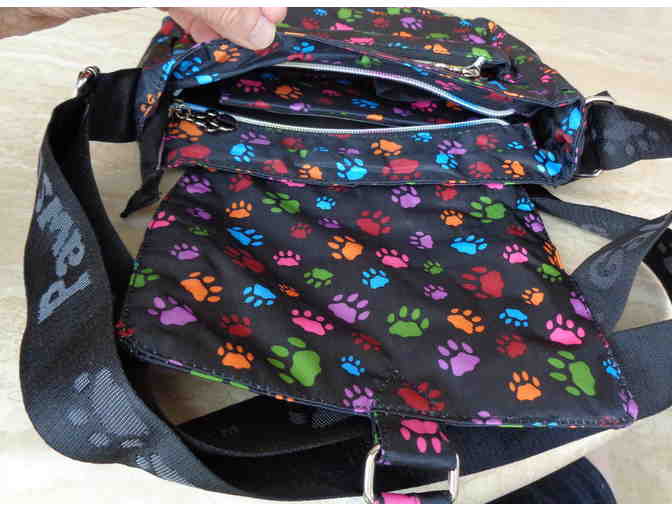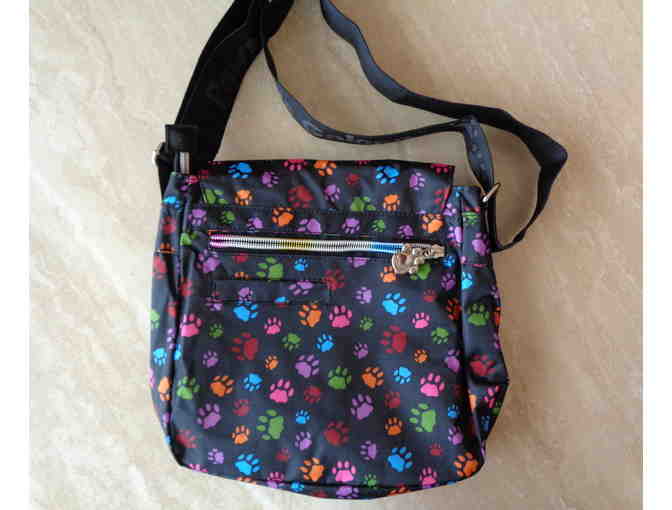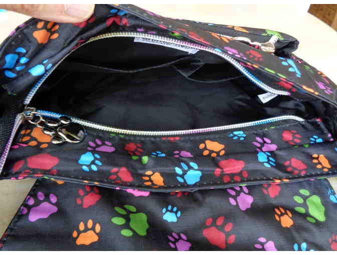 Prancing colorful paws pattern our fun and casual bag perfect for day trips. Featuring a black woven handle with the words "Paws Galore™," rainbow-hued zippers complete with paw print charms dangling from the ends, adjustable straps, inside and outside pockets, and a removable zippered coin purse.