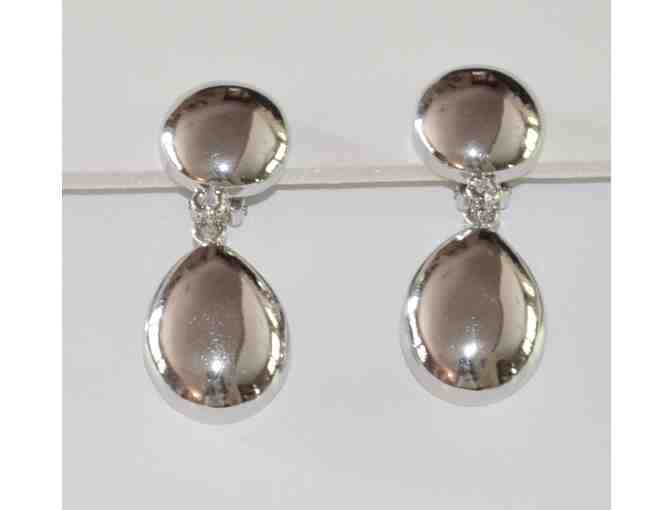 Neat pair of silver-tone drop clip-on earrings that has a round disc with teardrop shaped disc below. Has 2" drop.