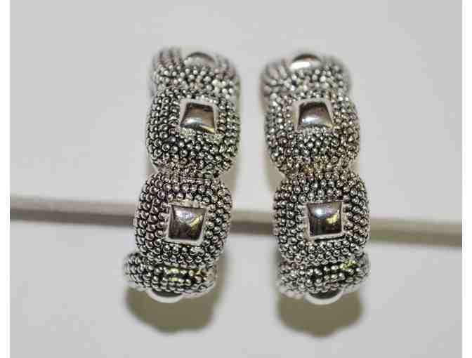 Pretty pair of silver-tone clip-on hoop earrings with 4 squares of knobby pattern surrounding a smooth raised square. Hoops measure 7/8" L x .25" W.