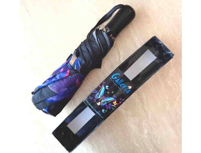 New Moonlight Butterfly Folding Umbrella. Colorful butterflies big & small! By Galleria, this black umbrella has a push button to open and to close. Has 48" arc, 100% Pongee double cover, wooden one-piece shaft/handle, unbreakable fiberglass ribs.