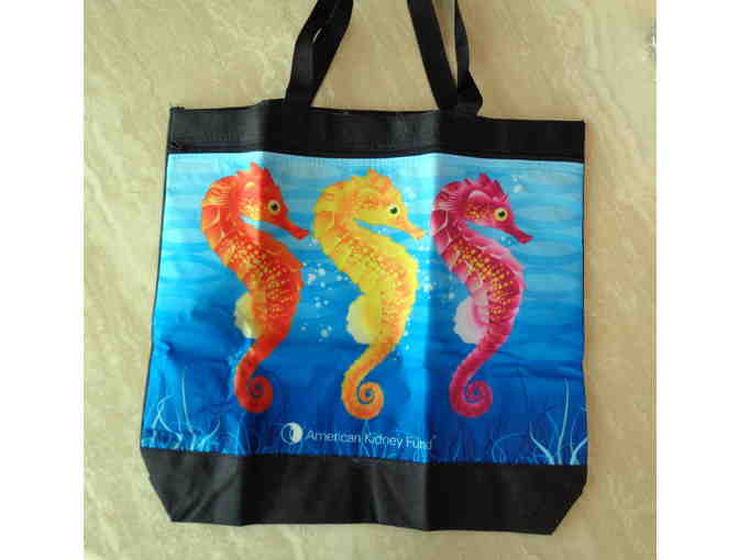 This grocery tote has two compartment, one with a velcro closure; the other with a zipper closure. Measures 17" x 16". From the American Kidney Fund.