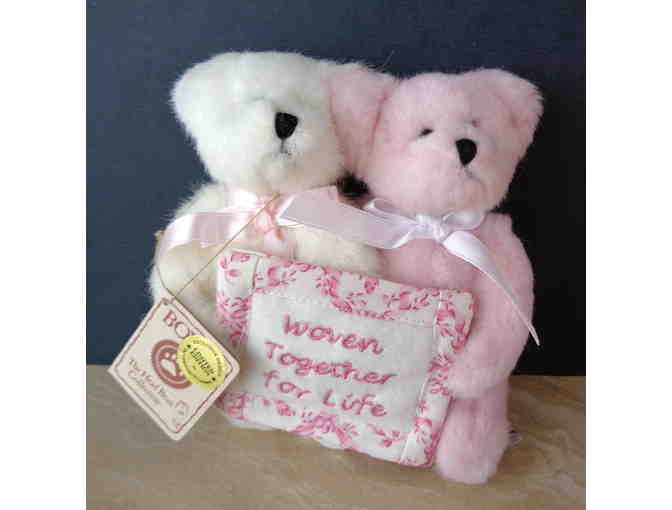 One pink and one white teddy bear attached and holding a sign that says, "Woven Together for Life." From the Head Bean Collection of Boyd. Measures 5" tall. Adorable!