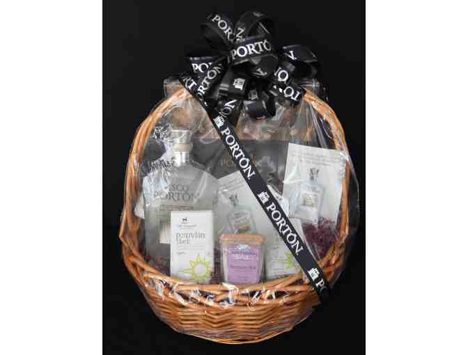 Celebrate a special occasion with this basket of Peruvian chocolate, Peruvian pink salt, and a bottle of Pisco Porton with a coffee table book of the history of Pisco Porton.