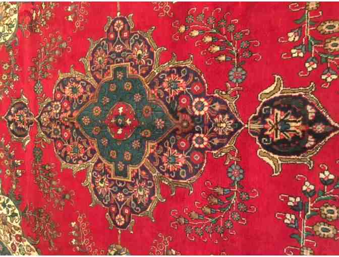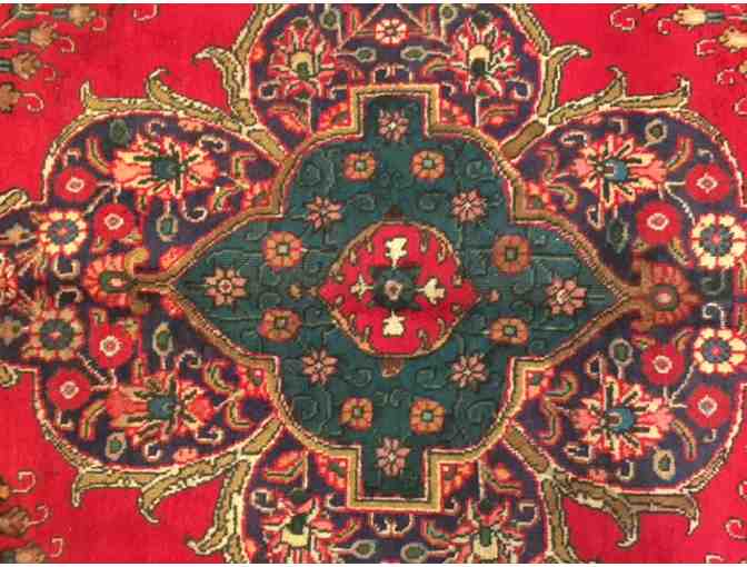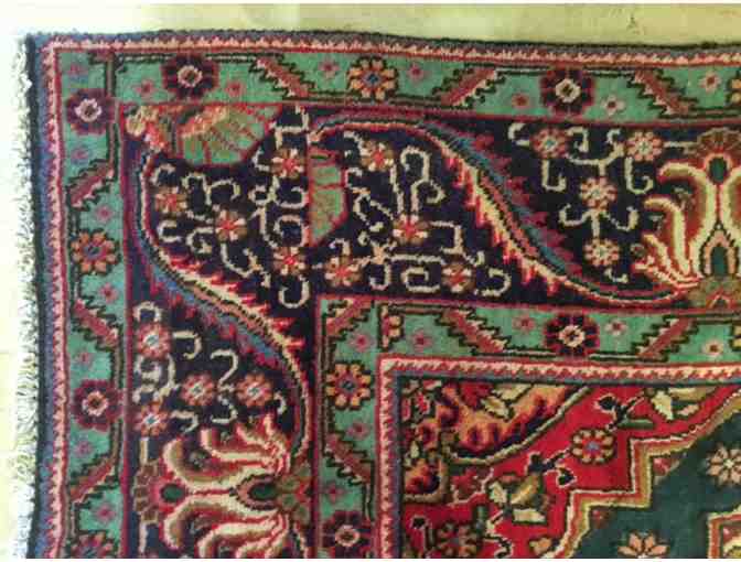 The design is a traditional center medallion design in the traditional reds, greens, and blues of Persian rugs.