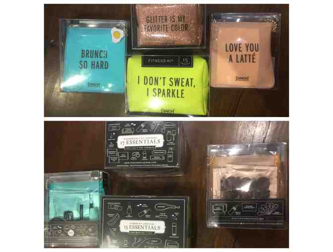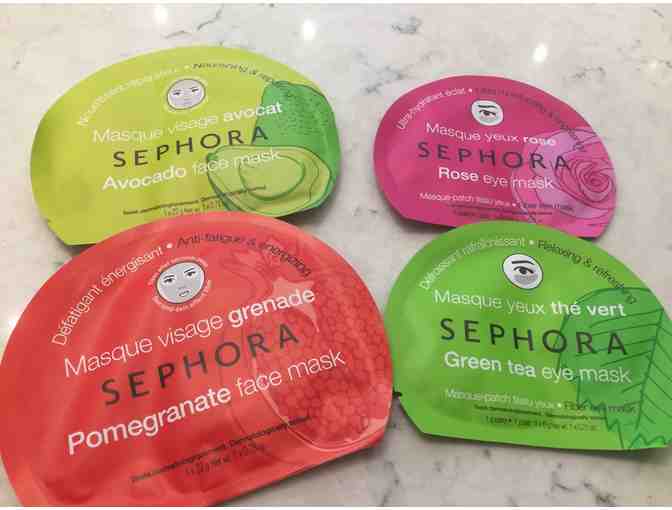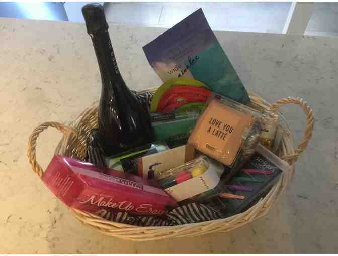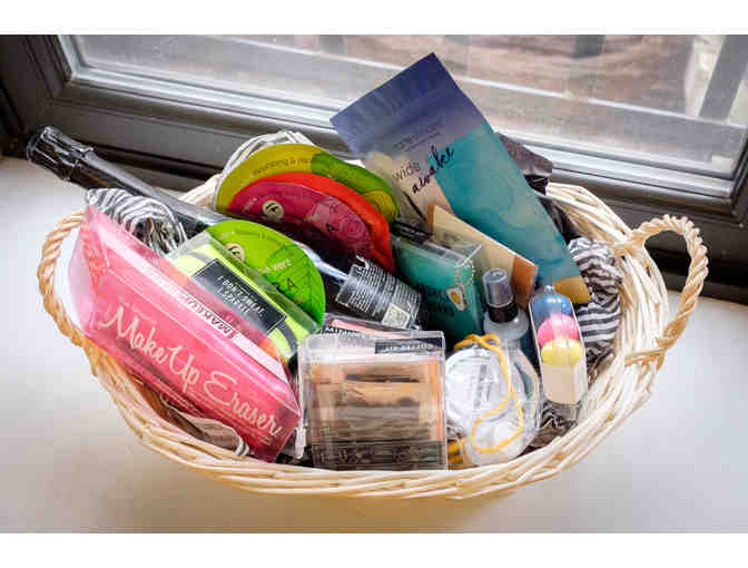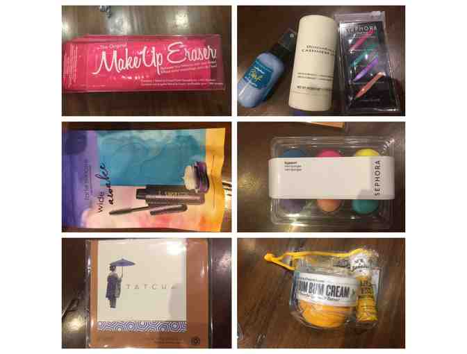 Basket includes: J cuvée 20, 4 different Pinch Provisions kits (mini emergency kit, fitness kit, coffee kit, and brunch kit); the original Make Up Eraser; Brazilian Bum Bum Cream and Lip Butter; Bumble and Bumble Surf Infusion hair mist; Tatcha Japanese beauty papers; Set of 4 mini tweezers; 4 Sephora masks (green tea, rose, pomegranate, and avocado); DonnaKaran Cashmere Mist Anti-perspirant; Sephora mini sponges; and Tarte Skincare Wide Awake (mascara, eye treatment and eye patches).