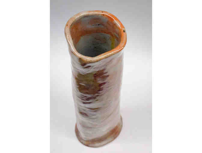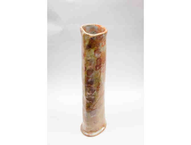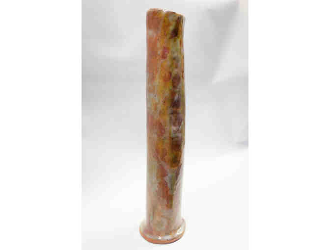 A 13 x 3 inch stoneware cylinder with fall vibrant colors and some asymmetry which adds to the art form.