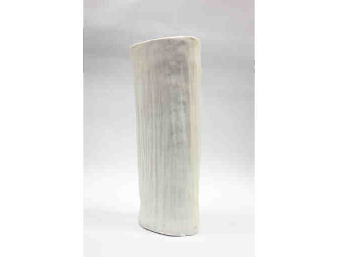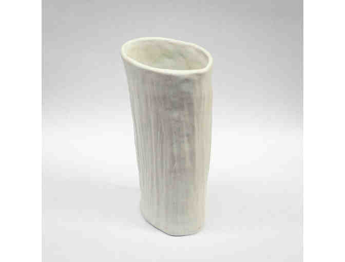 This is a carved tree pattern vase white in white. Dimensions: 8 x 3 inches.