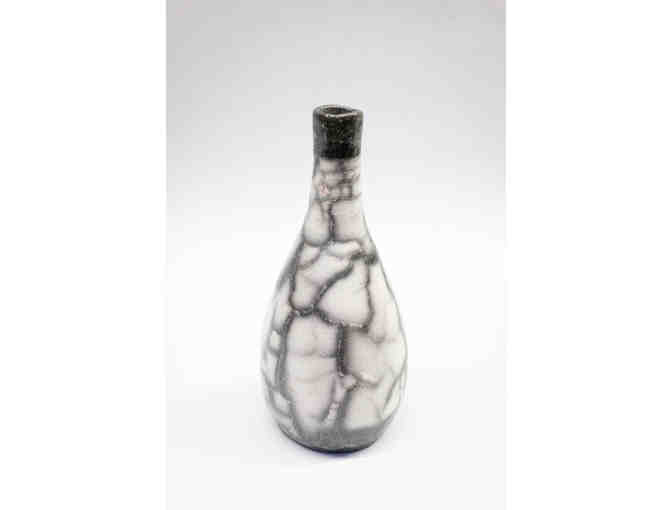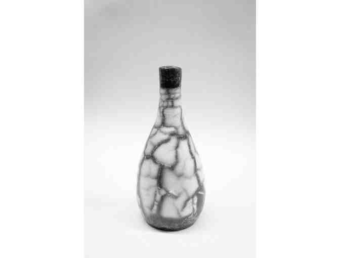 6 x 3 Naked raku is a form of raku slip technique. When reduced in the outdoor kiln the slip causes the glaze to come off and the interior smoldered in black patterns on white. The surface has an alabaster feel and is coated 10 times with wax