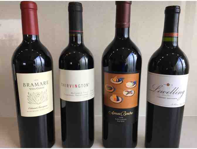 Four bottles of cabernet sauvignon including a 2012 Lewelling Cab from Napa, a Shirvington from Australia, a Bramere Vina Cobos 2010 from Argentina and a 2005 Amuse Bouche from Napa.