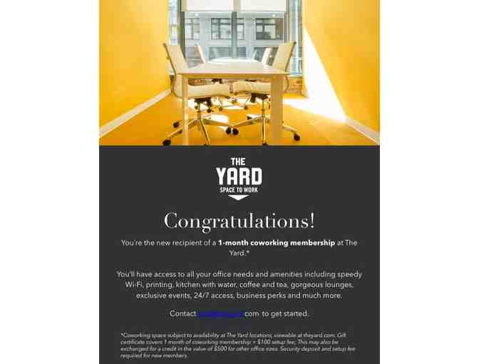 Coworking space subject to availability at The Yard locations. Gift certificate covers 1 month of coworking membership + $100 setup fee; This may also be exchanged for a credit in the value of $500 for other office sizes. Security deposit will be required to become a member.