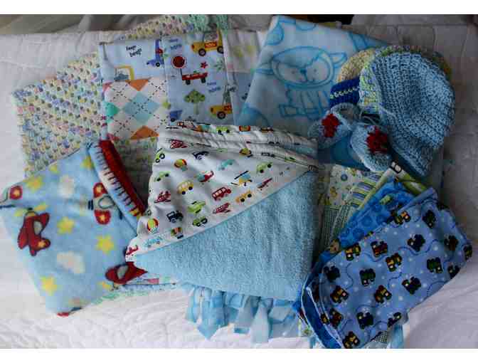 A package of Grandma-made goodies for a new baby boy. Includes burp cloths, crocheted hats and booties, a crocheted blanket, fleece blankets, a quilt and a towel. All are soft and adorable patterns, and made with love by the Grandma of Grace and Sadie Reynolds.