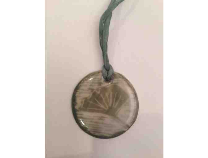 Porcelain, hand painted in celadon with a high fire glaze. These are attached by a strand of hand-dyed silk. Necklace is 2 1/2 inches width.