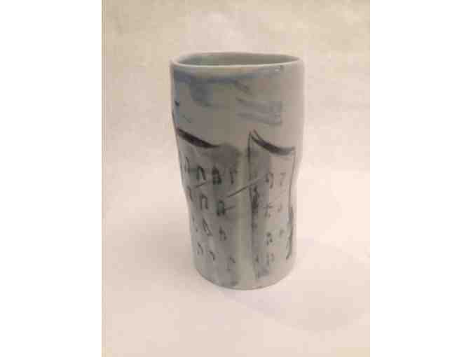 Wheel-thrown porcelain vase with a black underglaze with a city scape drawing.