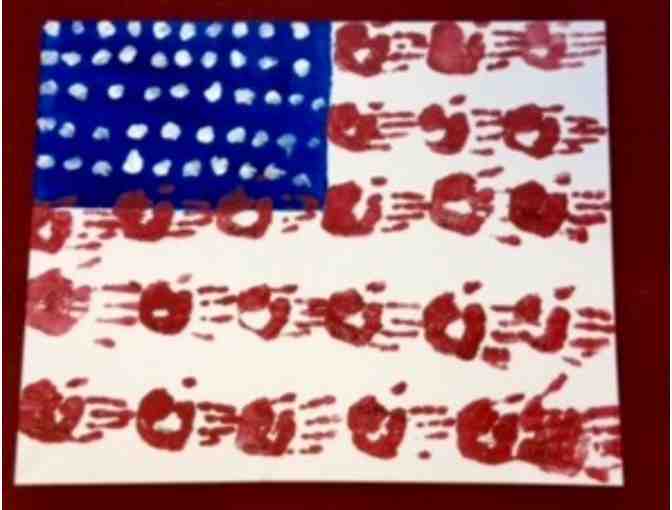 The students created a canvas of their handprints made into the American Flag, to represent the work they've done learning about the each of the States this year. They used their finger prints to make the stars and they have written their names under their handprint. This priceless work of art will adorn your walls representing love of country and child.