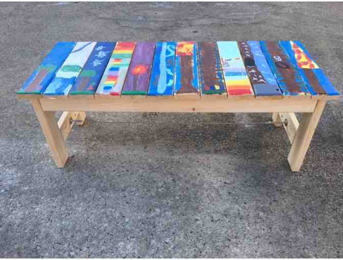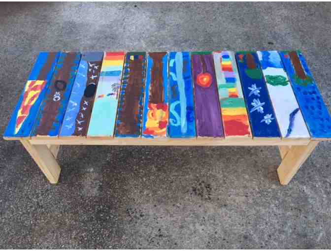 Ms. Weiner's 1st/2nd grade flex class worked their creative magic in designing this stunning 4 foot bench, versatile for both a quiet spot in the garden or as a utilitarian piece in your mudroom. It is boldly colored in hues of blue, green and brown, representing nature, with pops of red and yellow to make this a standout piece for your home.