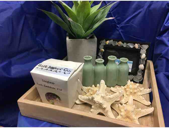 This beach inspired home accessories package from Water's Edge Seaglass & Salt Water Co. includes a rustic platter, faux plant, seaglass kit, photo frame, bud vase and decorative starfish.