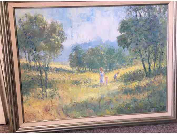 This beautiful oil painting by Richard Hasenfus is entitled "Girls in the Meadow" was painted in 1987 in the Impressionist style. This pastoral scene includes 3 figures - 1 adult female and 2 children. Artist is from Maine and was donated by the original owner.